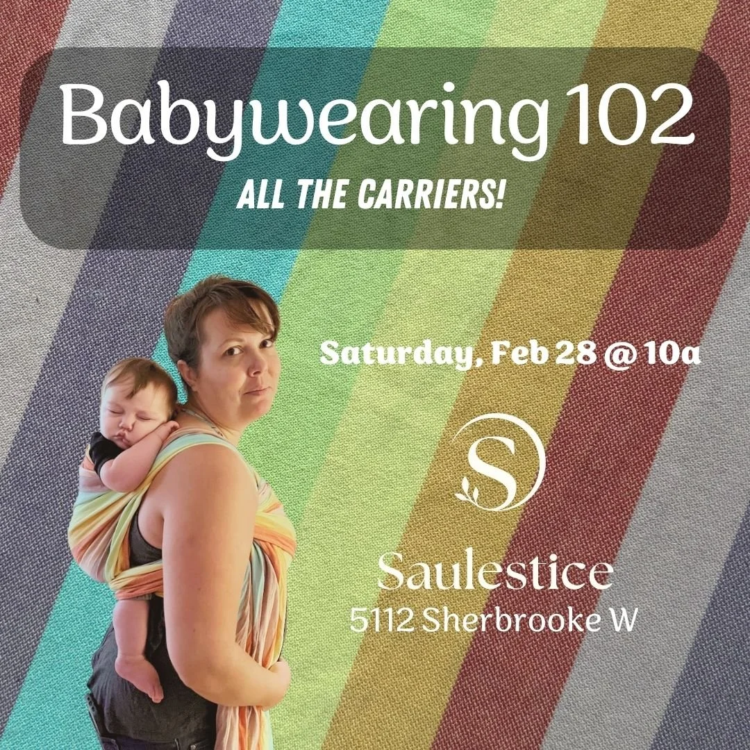 In this workshop, we’ll learn about different types of baby carriers and have a chance to try them. Then we will discuss safety and ergonomics. You’ll leave feeling confident wearing your little one. Click the photo below to register @ Saulestice!