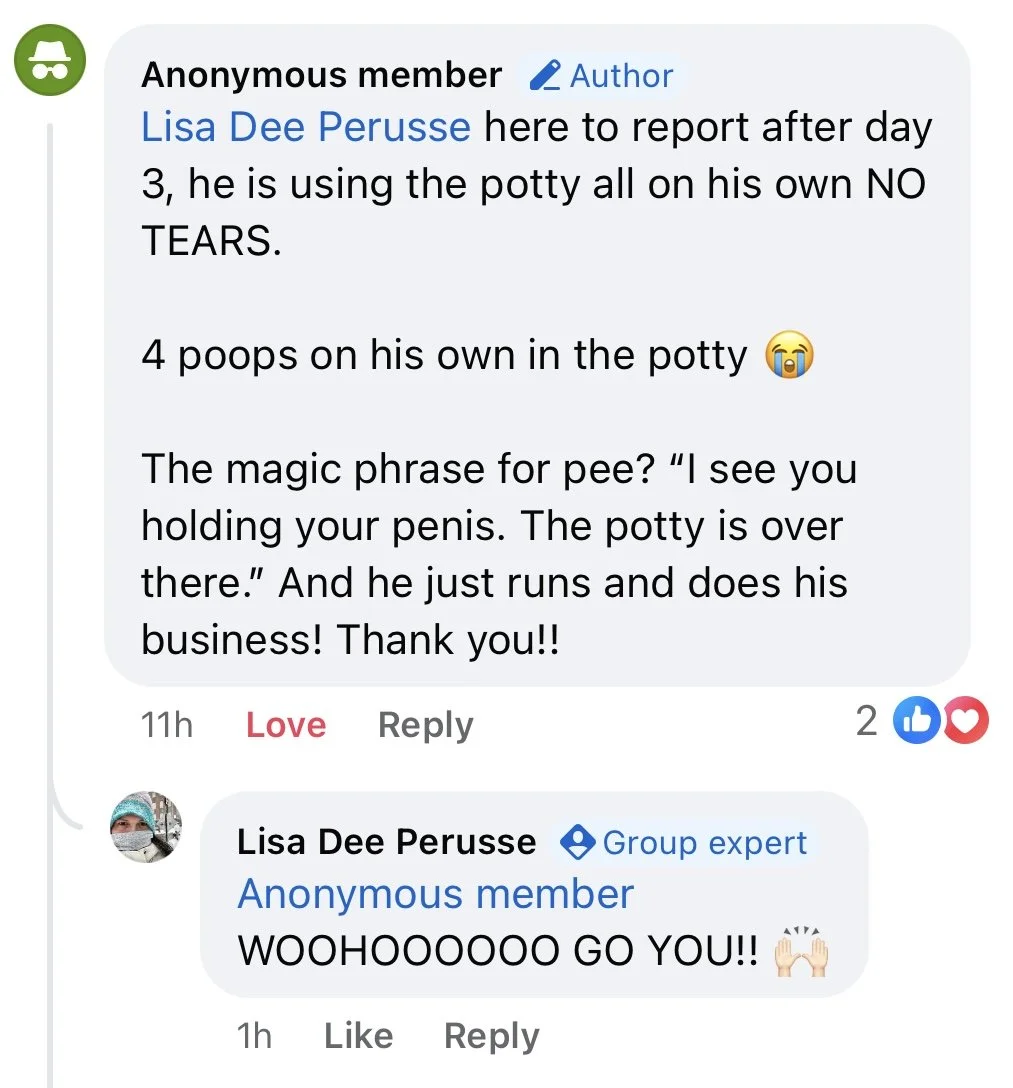 “I am so grateful for all the support I got from Lisa Dee. She helped my almost 5 year old overcome her phobia of pooping in the toilet. We’ve been struggling with this issue for almost 2 years, saw a couple of psychologists and had no success. When I found Dee, she guided me, supported me in a very gentle and kind way. My daughter overcame her fear, and the stress that came with it is gone now! And it was very quick too. Thank you for being so present, available and supportive!!!! If anyone is struggling with potty training, I hope they are lucky enough to come across Dee!”